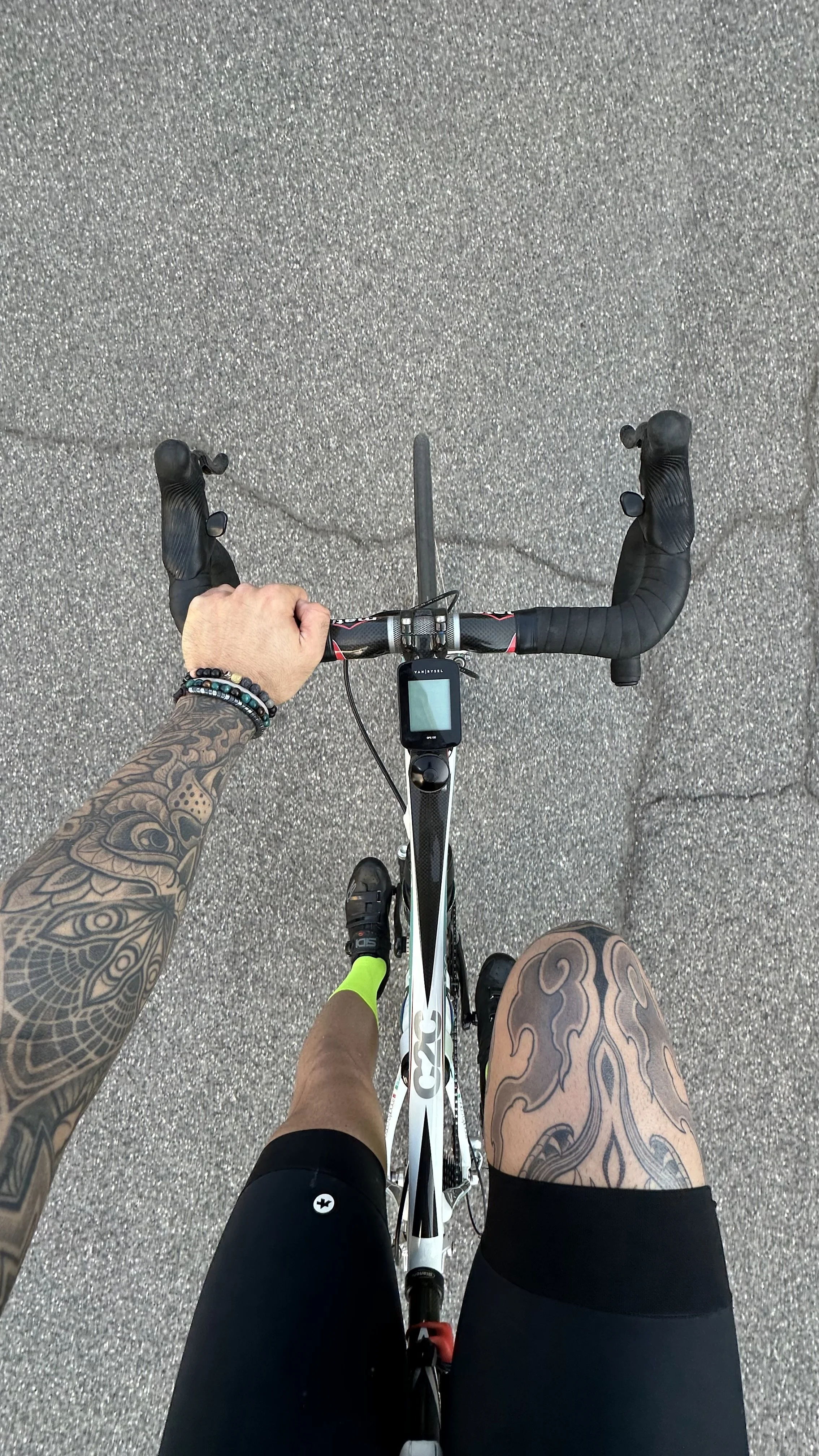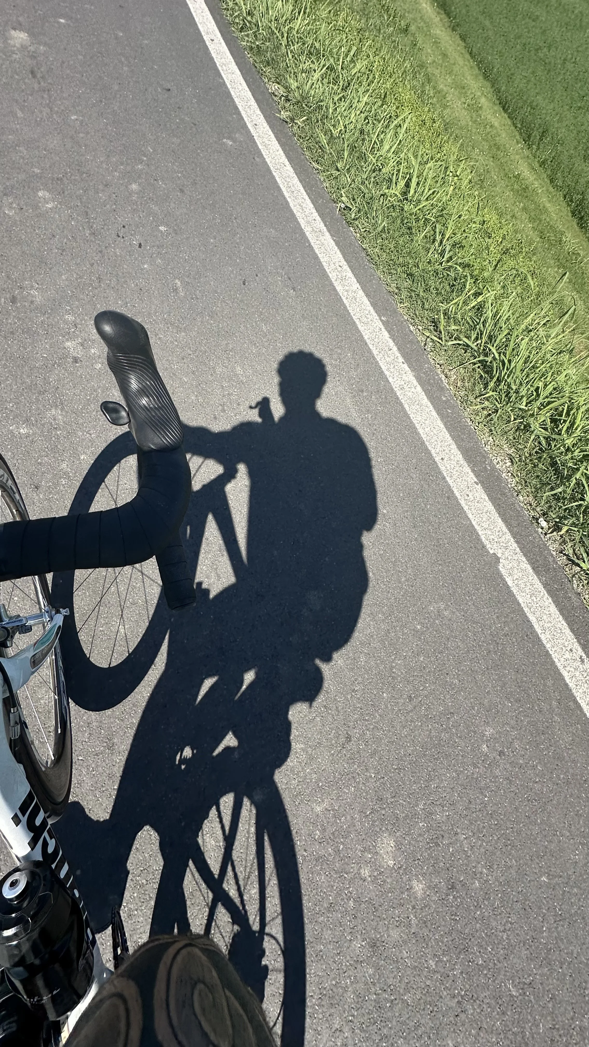 Una persona in bicicletta con casco e occhiali da sole, che prende una foto di sé stessa durante una giornata soleggiata in un paesaggio rurale.