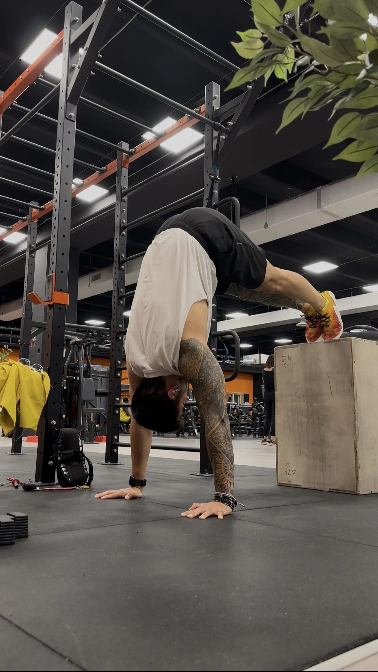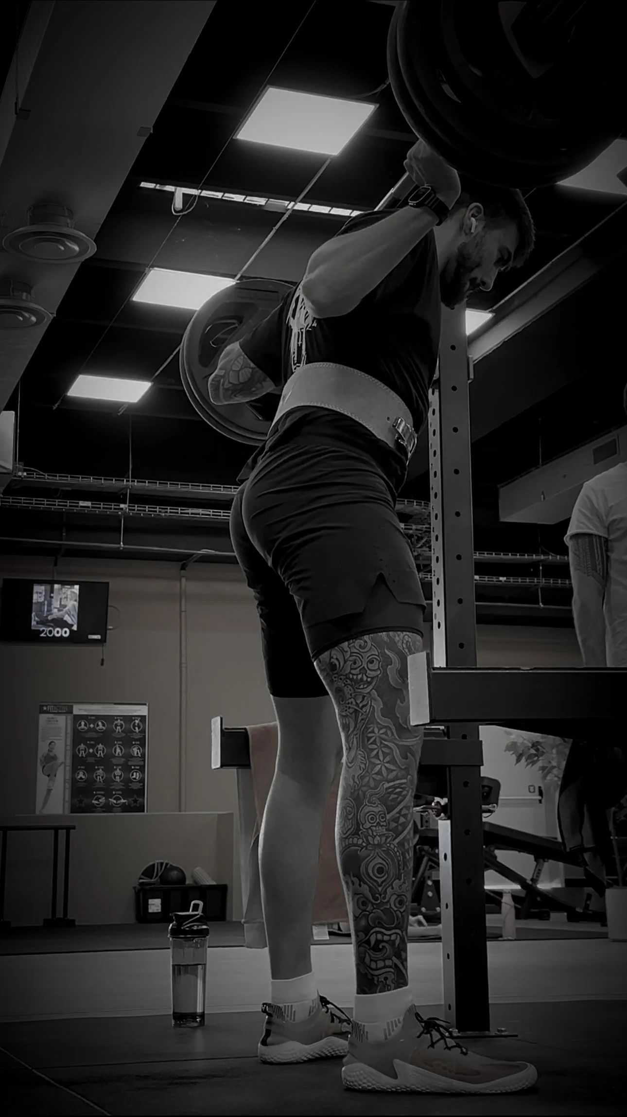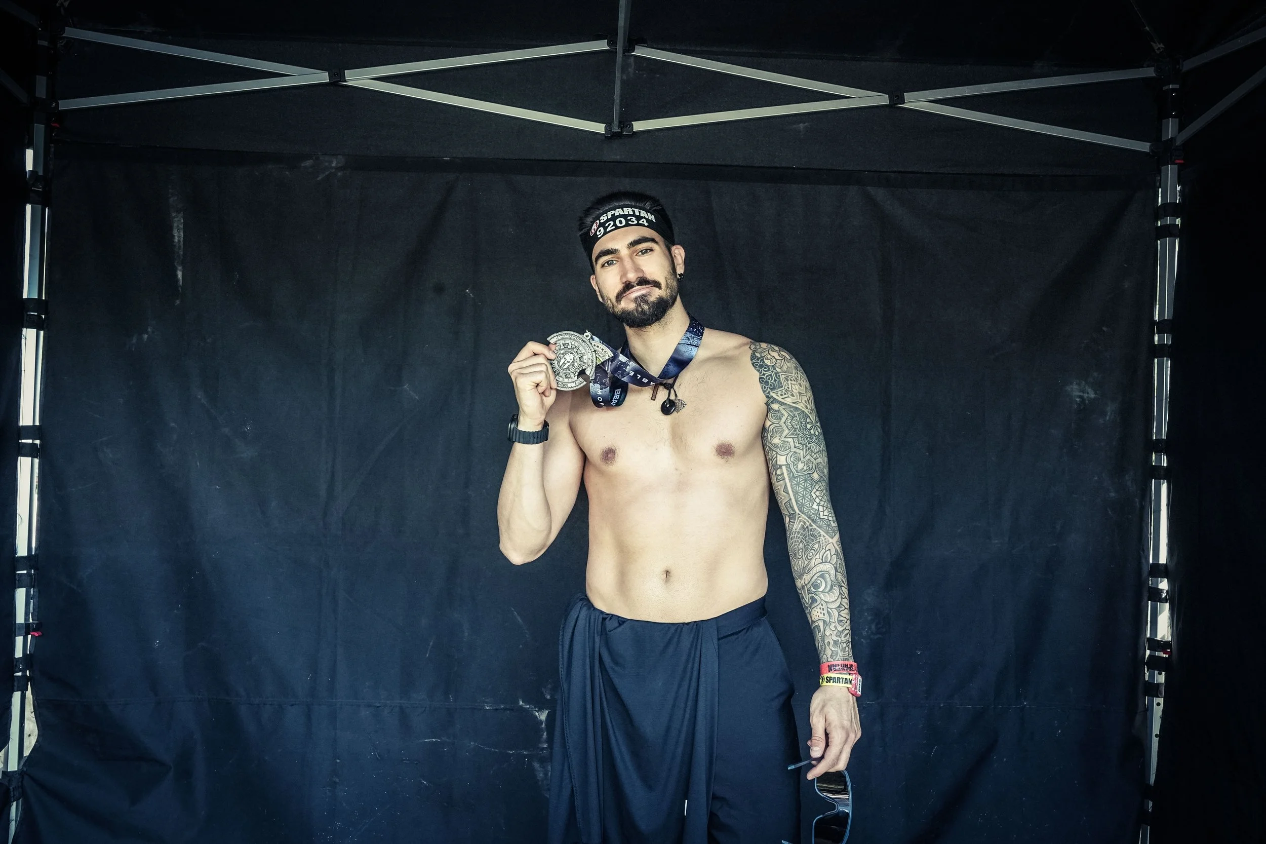 Uomo con maglietta e pantaloncini neri, con una fascia testa con scritto 'Spartan', tiene un disco di peso sulla spalla e fa una gestualità con la mano destra. Sfondo grigio chiaro.